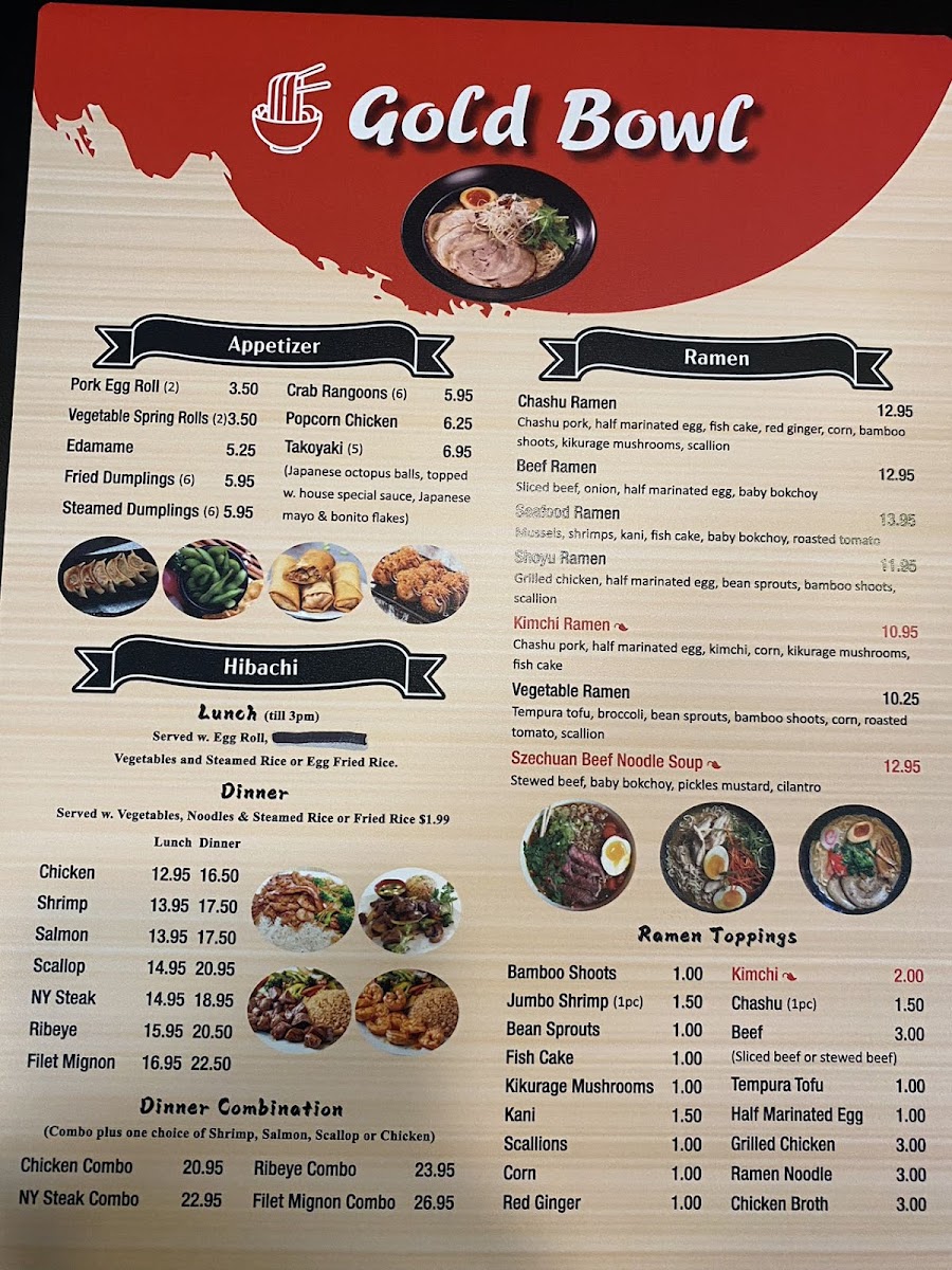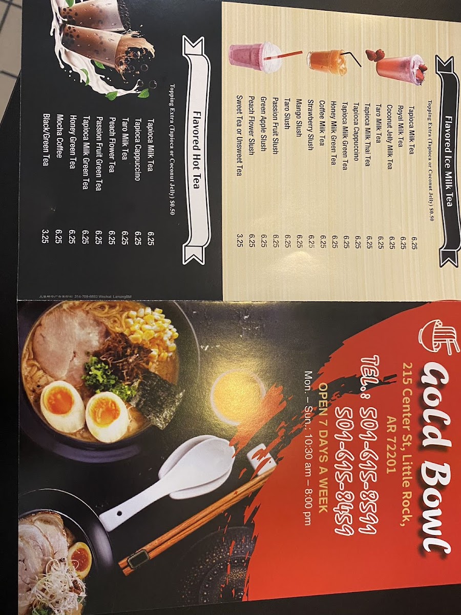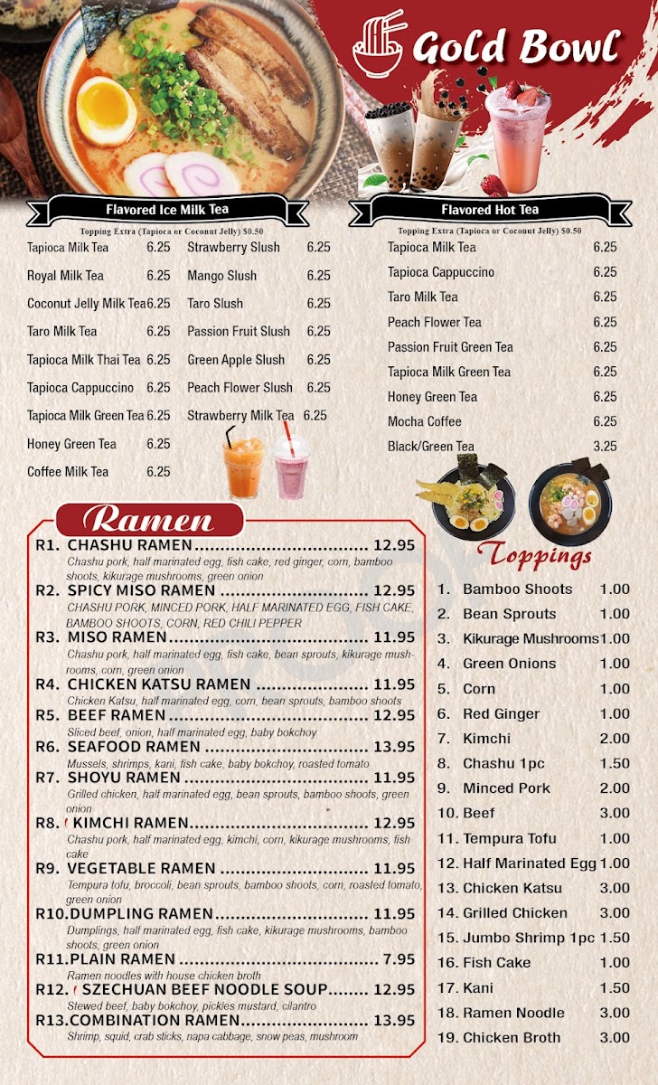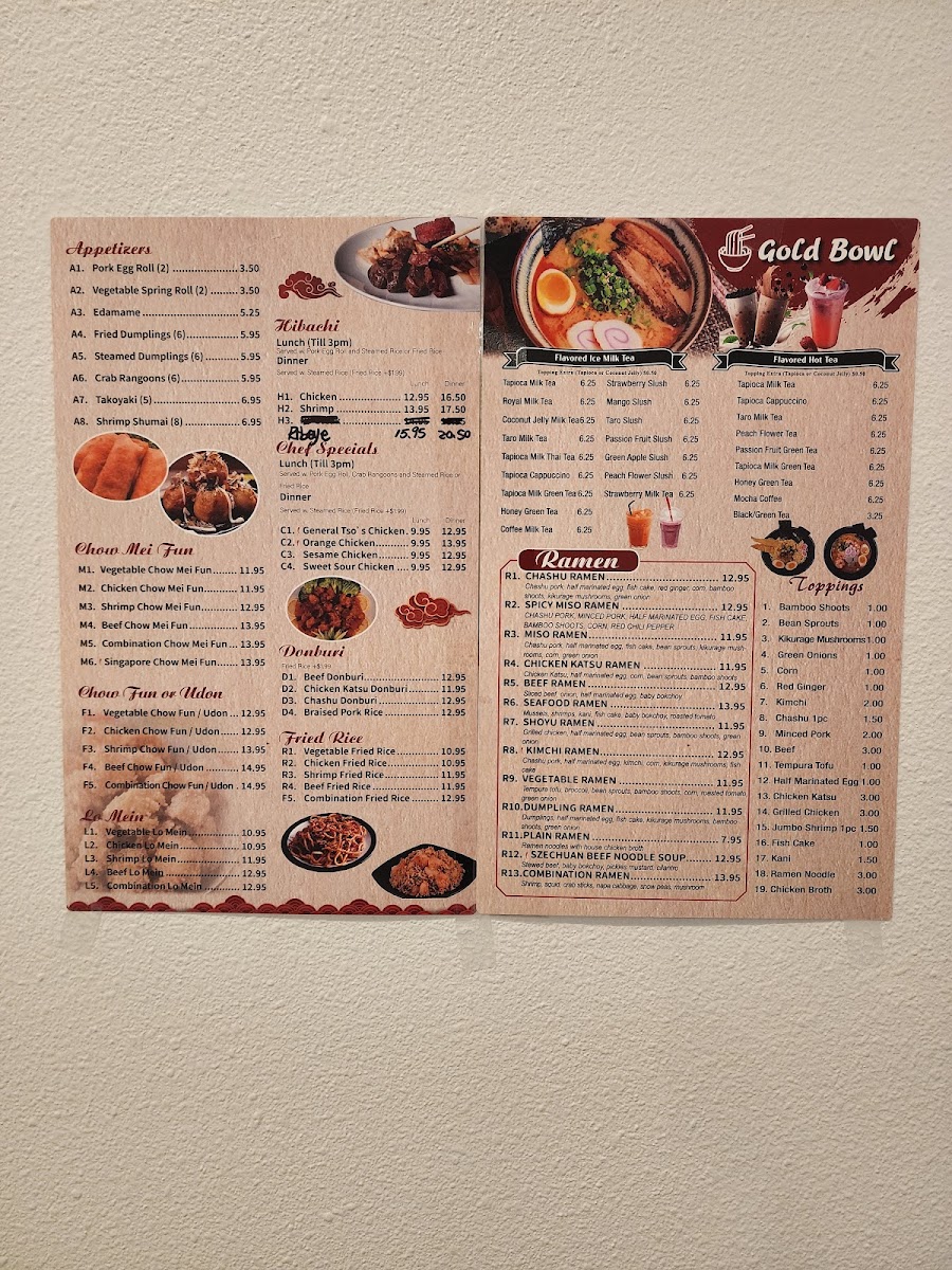 Gold Bowl offers a diverse and flavorful menu, with options that cater to a variety of tastes and preferences. For starters, patrons can enjoy appetizers such as Pork Egg Roll and Vegetable Spring Roll. The restaurant's chow options include several variations of Chow Mei Fun and Chow Fun or Udon, such as the Vegetable Chow Mei Fun and Chicken Chow Fun/Udon, with a choice of meats like shrimp, beef, and a combination of all. Additionally, their Lo Mein selections, such as Vegetable Lo Mein and Beef Lo Mein, deliver hearty, satisfying portions. For those craving a bowl of comfort, Beef Donburi and Chicken Katsu Donburi are top picks. The Fried Rice section also presents a great variety, from Vegetable Fried Rice to the Combination Fried Rice. As a refreshing drink, try one of their Flavored Ice Milk Teas, including the Tapioca Milk Tea or the Coconut Jelly Milk Tea. Ramen lovers will appreciate the Chashu Ramen or Spicy Miso Ramen. For a special treat, there are dinner combinations like the Ribeye Combo and Filet Mignon Combo. To top it off, you can indulge in satisfying entrees like General Tso's Chicken or Orange Chicken, with most of these dishes priced reasonably, like the General Tso's Chicken at $9.95. Gold Bowl delivers a delicious, affordable, and wide-ranging menu that leaves diners with plenty of delicious options to explore.